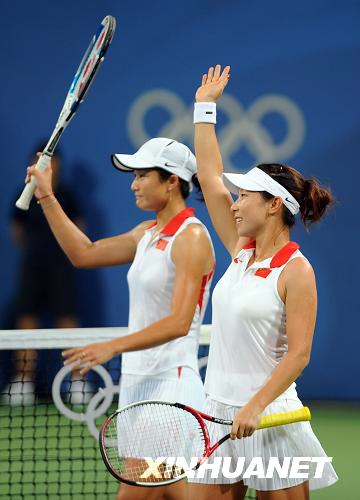 8月12日,晏紫/郑洁(右)庆祝胜利。当日,在北京奥运会网球女双首轮比赛中,中国选手晏紫/郑洁以2比0战胜斯洛伐克选手汉图霍娃/胡萨罗娃。新华社记者邹峥摄