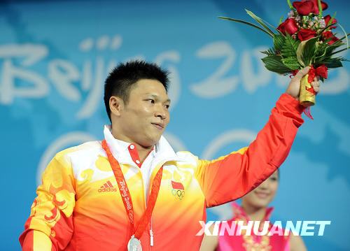 8月13日,中国选手李宏利在领奖台上。当日,李宏利在北京奥运会举重男子77公斤级决赛中以366公斤的总成绩获得银牌。新华社记者杨磊摄