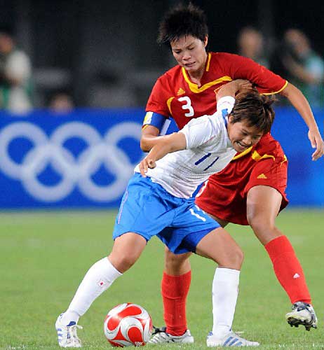 8月15日,日本队球员大野忍(前)与中国队球员李洁拼抢。 当晚,中国女足在秦皇岛奥体中心体育场举行的奥运会女足1/4决赛中以0比2不敌日本女足,未能进入四强。 新华社记者巩志宏摄